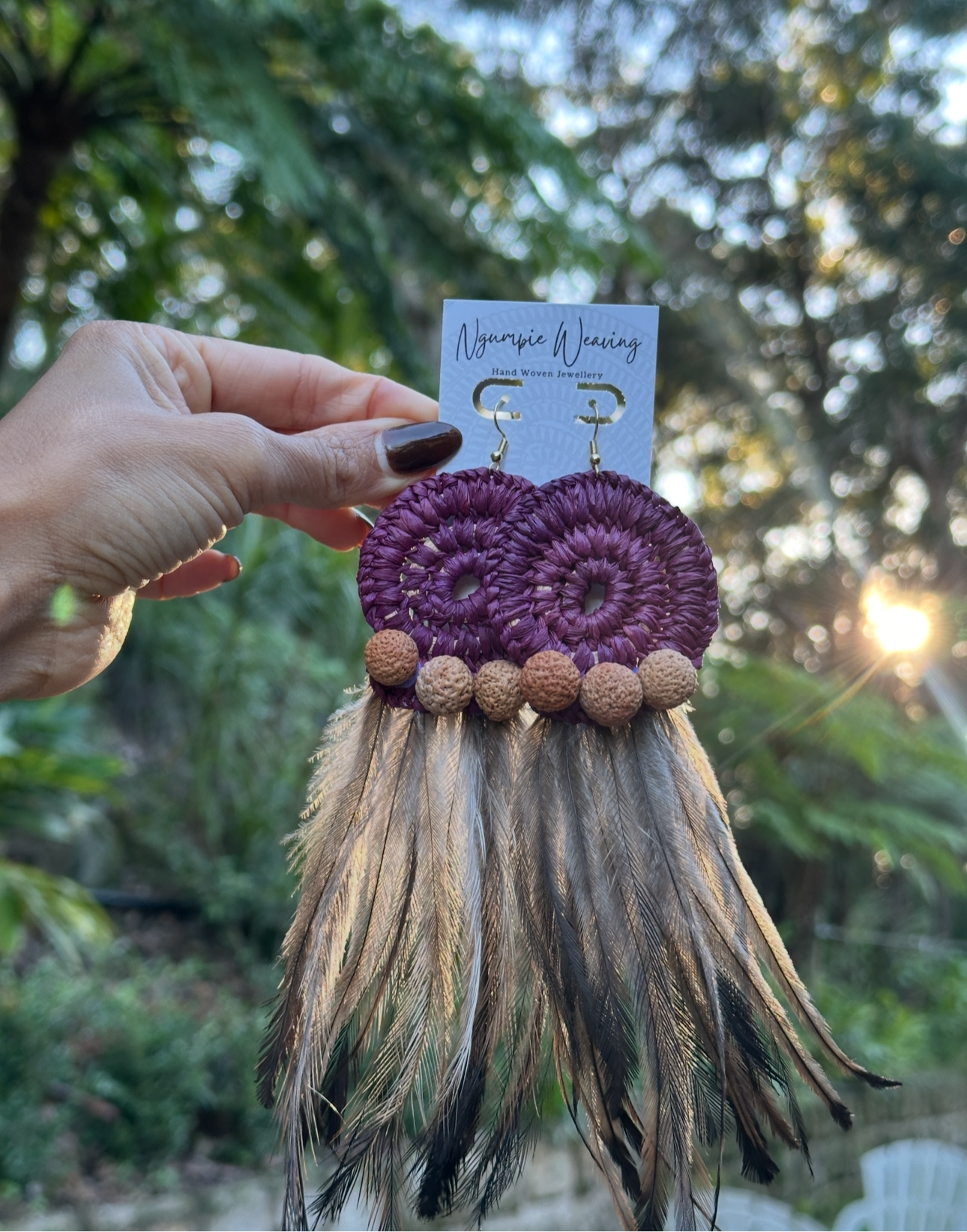 Discover our Elegant Empress Earrings, featuring rich maroon hues and soft, luxurious emu feathers. The graceful drop design showcases the unique texture of the feathers and quondong seeds adding a touch of sophistication to any outfit. Lightweight and comfortable for all-day wear, these earrings are perfect for both special occasions and everyday elegance. Embrace your inner empress and make a bold statement with this exquisite accessory!